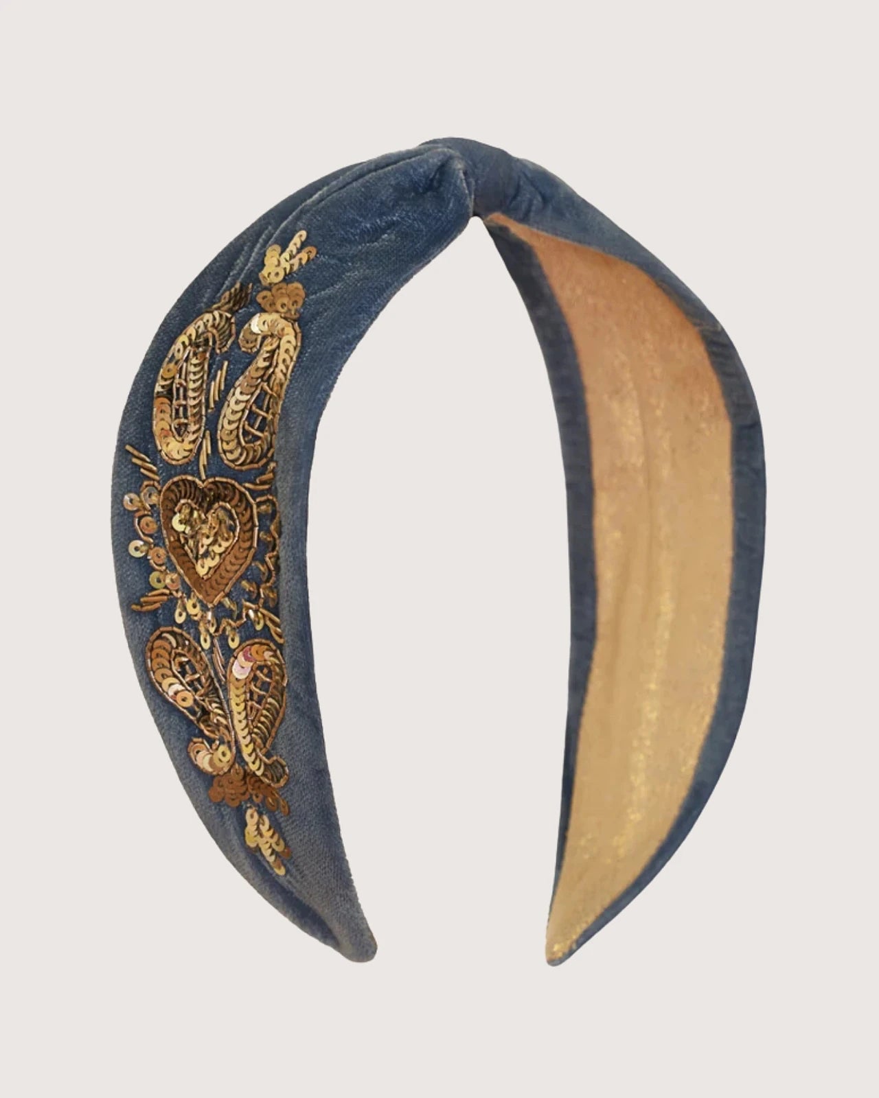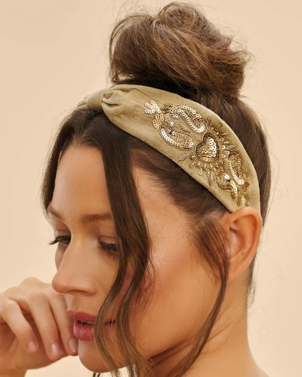 Creato dal brand scozzese Powder Design e realizzato a mano in India, ogni cerchietto è un piccolo giardino segreto da indossare: ricami che evocano foglie danzanti, cuori pulsanti, uccelli in volo e fiori che sbocciano sul velluto morbido come una carezza. La struttura imbottita regala volume e comfort, mentre i dettagli impreziositi con perline e fili metallici catturano la luce ad ogni movimento del capo.