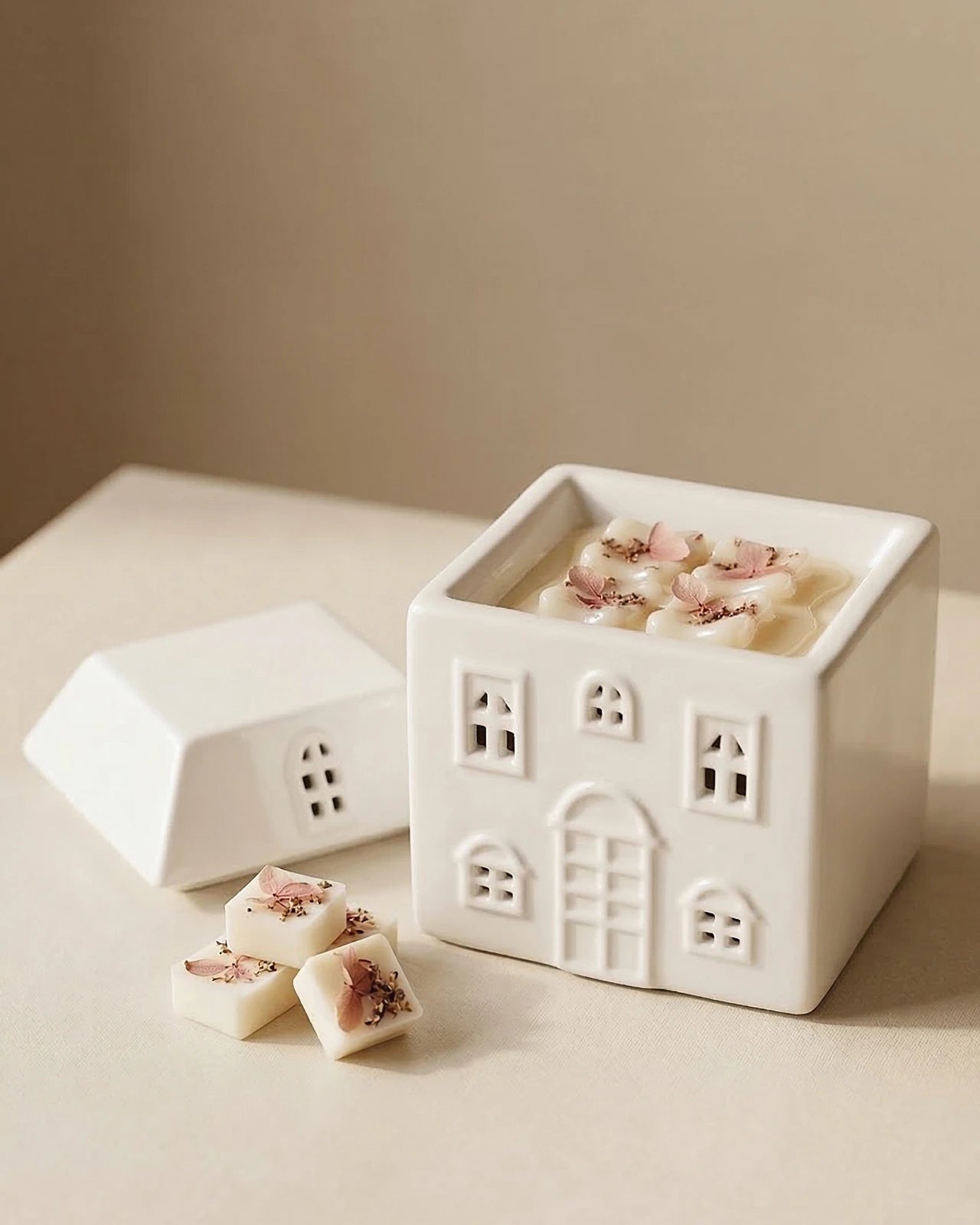 Bruciatore per Essenze o Tartine di Cera a Forma di Casetta in Ceramica Bianca