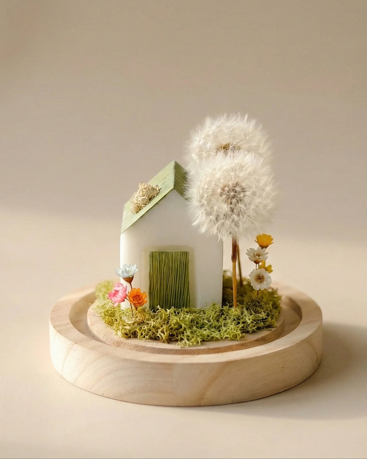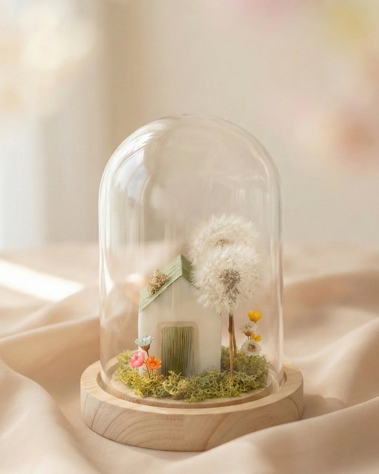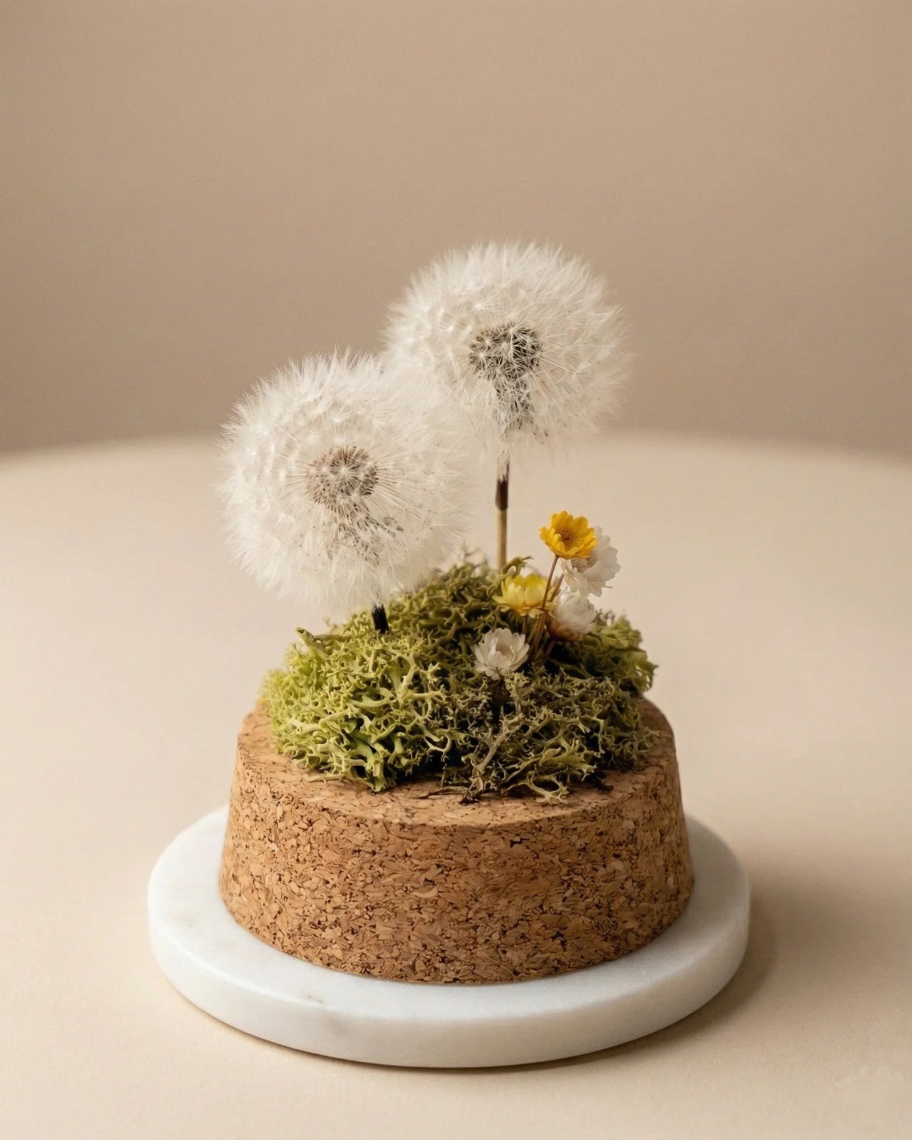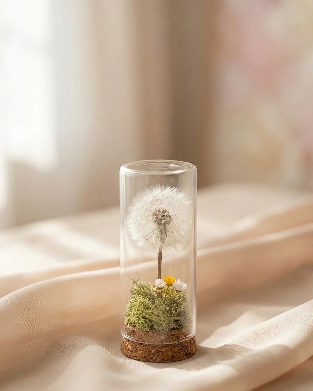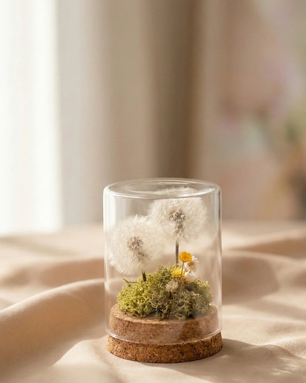 Immagina un prato primaverile in miniatura: in questo terrarium, un autentico soffione si erge delicatamente su un letto di muschio stabilizzato, mentre piccole glixie bianche e gialle danzano intorno come stelle cadute dal cielo. Ogni elemento di questo piccolo giardino incantato racconta una storia di leggerezza, speranza e bellezza che non appassisce mai.